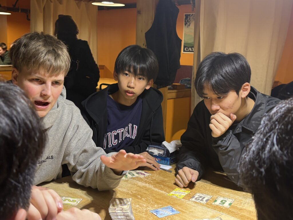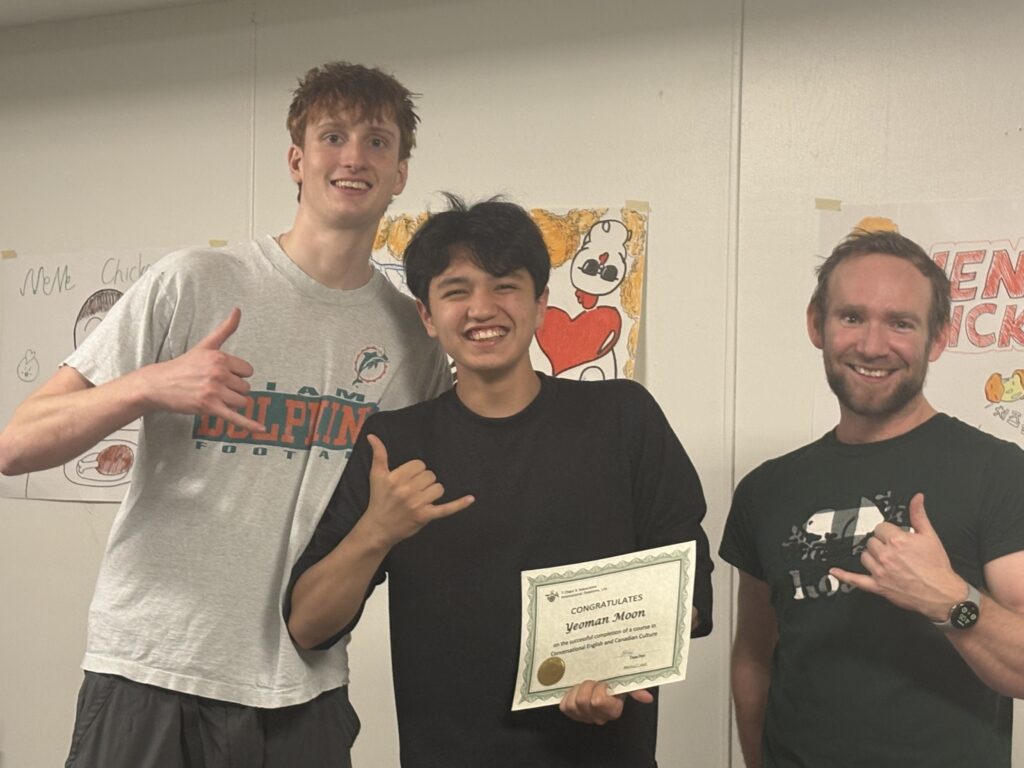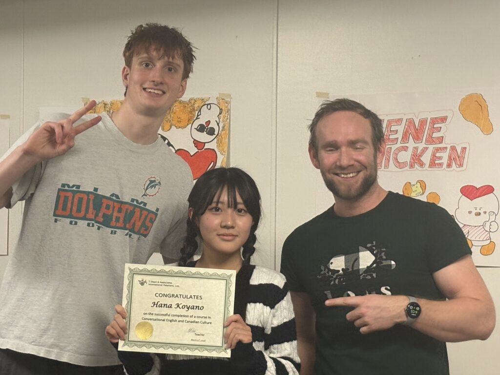 カナダ研修も早くも5日目を迎え、最後の授業となりました。まず、Keep talking&Nobody explodesというゲームを用いて行われました。制限時間内にいくつかの問題を解き、爆弾が爆発しないようにするものです。何回か失敗もしましたが、みんなで協力しながら取り組み、最終的になんとか爆発せずにクリアすることができました。 午後の授業では、Chips tasting&Drink tastingを行い、味比べをした後、人気投票を行いました。また、文が書かれた場所を探し、文を覚えて基地に戻って書きとるゲームや絵を書いて対決するゲームも行いました。 ここにきて、英語に耳が慣れてきたという生徒が増え、英語でのやり取りがスムーズに進むようになりました。間違えを恐れず、間違えたら失敗から学べばいいという姿勢に変わり、英語をツールとして使えるようになってきました。 そして、修了証を受け取り、レッスンを終えました。