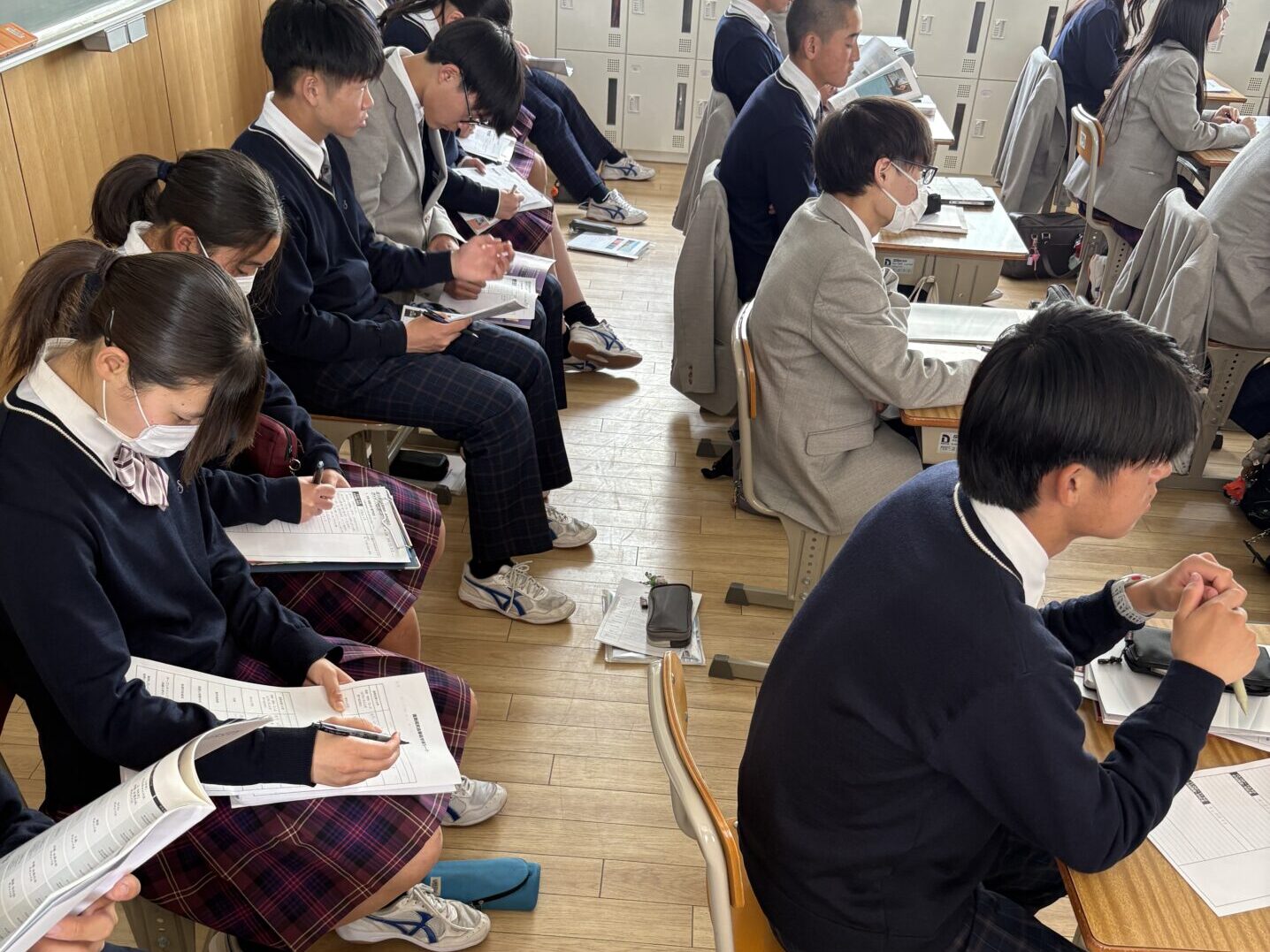 生徒たちは事前に希望した進路先の教室に分かれて、各自3校から説明を受けました。各校の方々から直接お話いただく講話形式の教室や少人数のグループでの対面形式、またオンラインの説明を受ける教室など、形態はさまざまでしたが、生徒たちは皆熱心に耳を傾け、メモを取りながら自分の将来像を思い描いている様子でした。参加レポートによると、「大学によって特徴や魅力に違いがあることがよくわかった」「事前学習をしていたので昨年よりも情報が頭に入ってきてよかった」「ボランティアの重要性に気づいた」「夏休みのオープンキャンパスにも参加してみたいと思った」などの感想があり、1、2年の間にできることは何かを深く考えることができたようです。